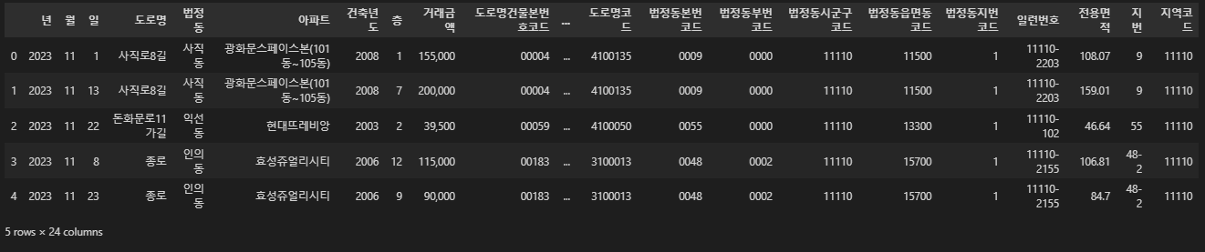 ,columns=["년","월","일","도로명","법정동","아파트","건축년도","층","거래금액","도로명건물본번호코드","도로명건물부번호코드","도로명시군구코드","도로명일련번호코드","도로명지상지하코드","도로명코드"