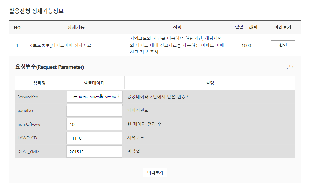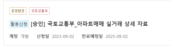 공공데이터포털에 들어가서 실거래 상세 자료를 입력합니다.