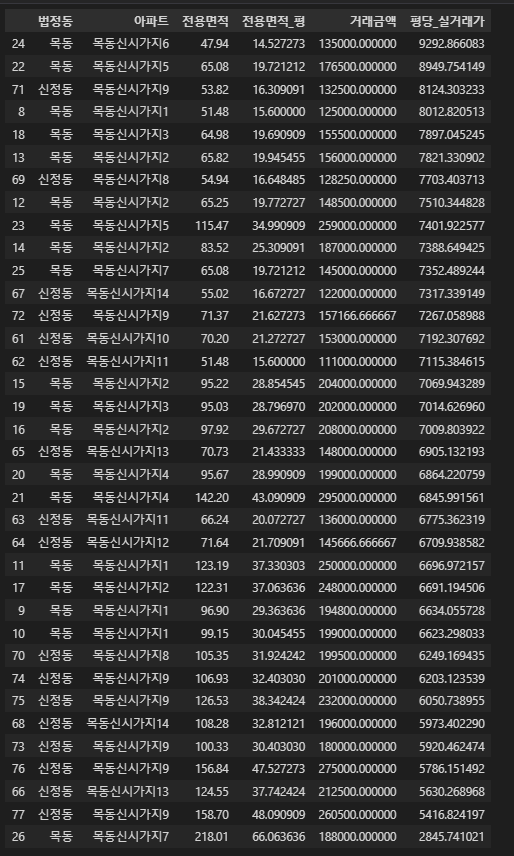 2) 목동 신시가지 단지 아파트의 평당 실거래가 금액 구하기