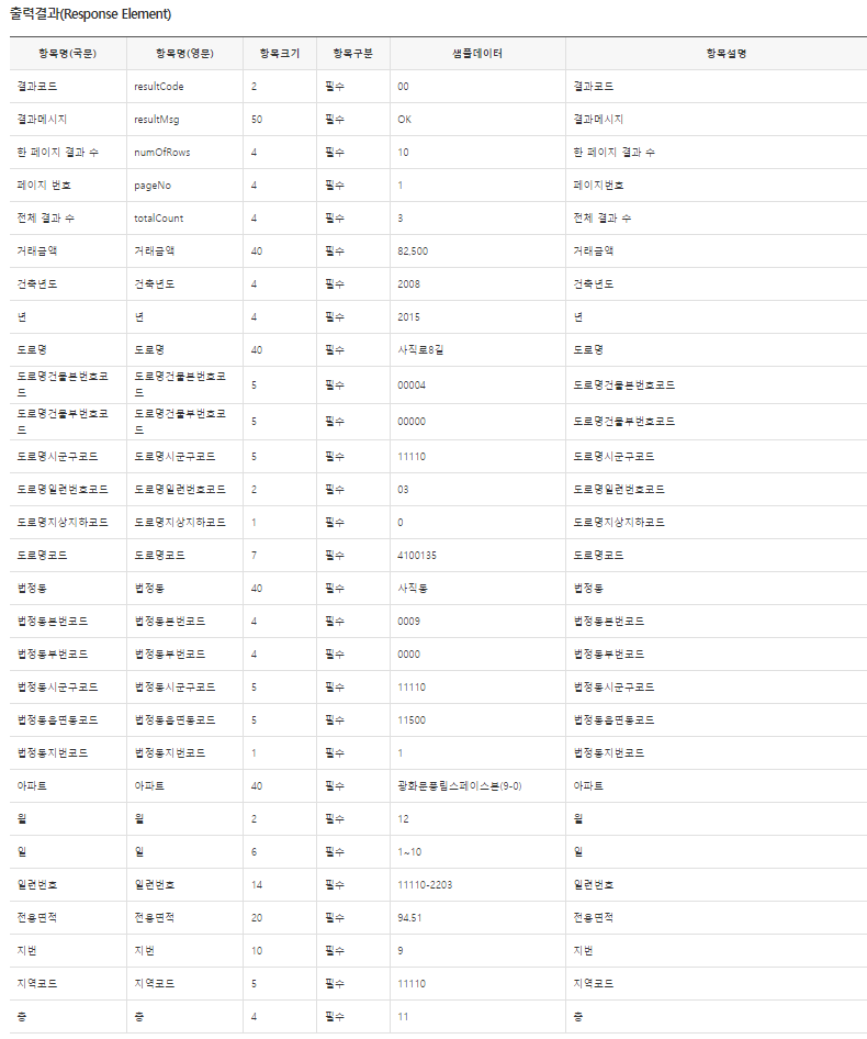 상세가 아닌 일반 API도 존재하는데 컬럼 갯수가 더 단순한 편입니다.