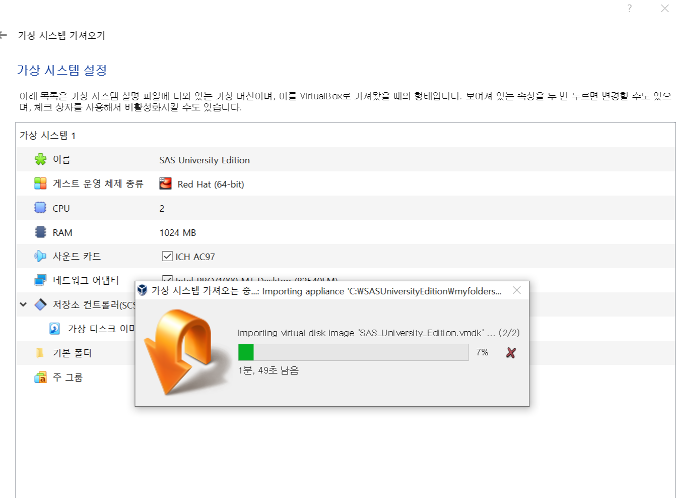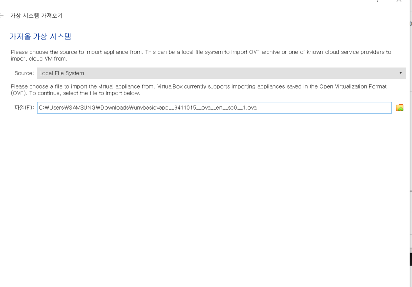 - 가져올 가상 시스템의 파일은 3에서 다운로드한 파일로 지정해줍니다.