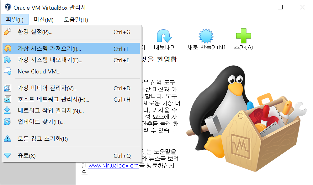 - 2에서 설치한 가상화 소프트웨어에서 가상 시스템 가져오기를 클릭합니다.