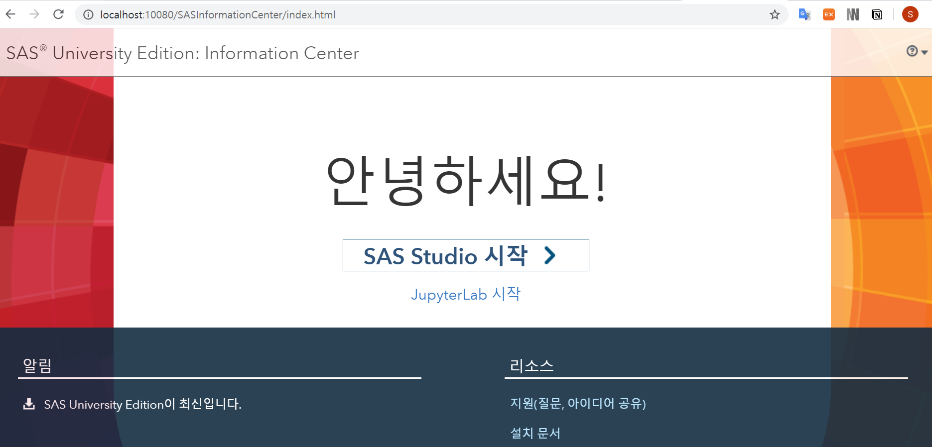 - http://localhost:10080로 들어가서 SAS STUDIO 시작을 누릅니다.